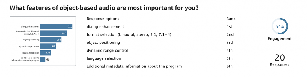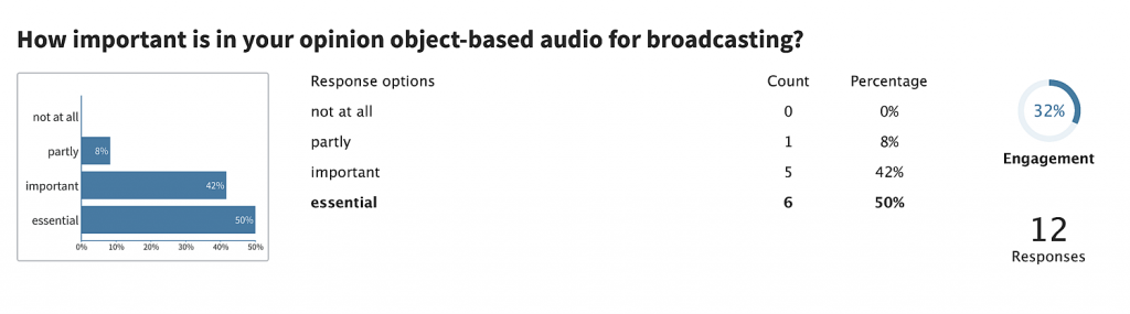 Very encouraging were the results of some live polling in the room during the closing round table discussions. To sum up, object-based is regarded as tomorrow’sbroadcast technology, open standards for it are essential and the main features of the first implementation cycle are indeed most requested.